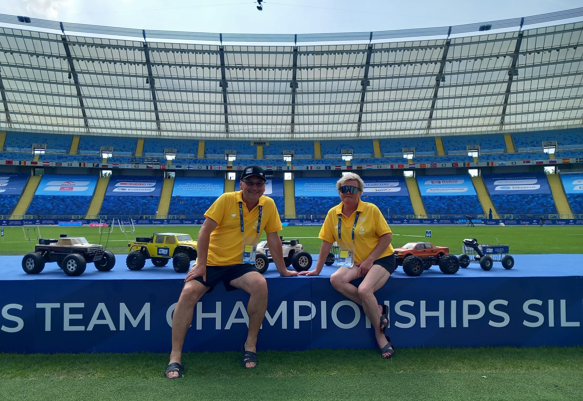 Na atletických závodech se staráme o přepravu náčiní pomocí speciálně upravených RC modelů aut. Naše auta převážejí oštěpy, kladiva, disky a koule přímo z místa dopadu zpět k závodníkům.